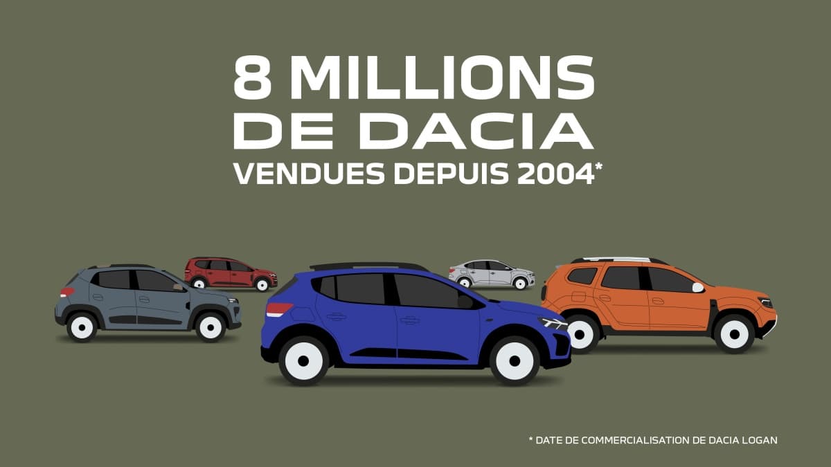Fort de sa gamme et de modèles best-seller, Dacia a atteint le chiffre symbolique de 8 millions de ventes en 2023. Réparties par modèle cela représente 2,78 millions de Sandero, 2,26 millions de Duster, 1,97 de Logan, 630 000 Dokker, 346 000 Lodgy, 93 000 Spring, 80 000 Jogger, 56 000 Pick-up et 51 000 Solenza