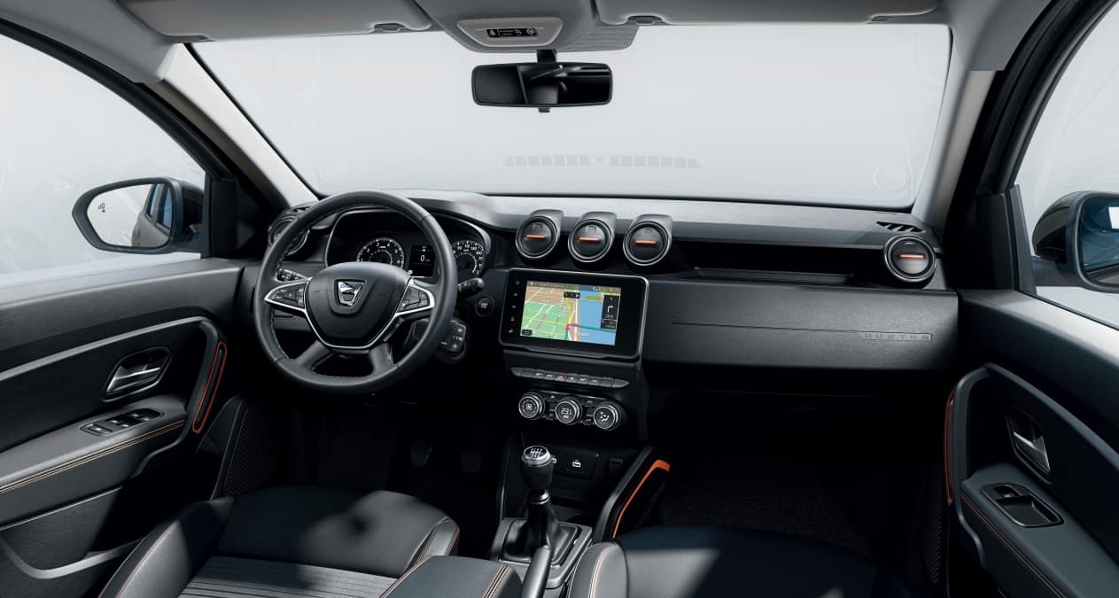 L’intérieur de la Duster Extreme se caractérise par une sellerie spécifique en tissu / TEP avec surpiqûres orange, des inserts orange sur les aérateurs, l’accoudoir central, les poignées de porte et les garnitures de la console centrale.